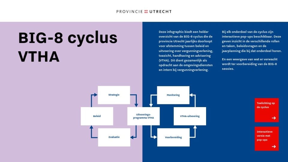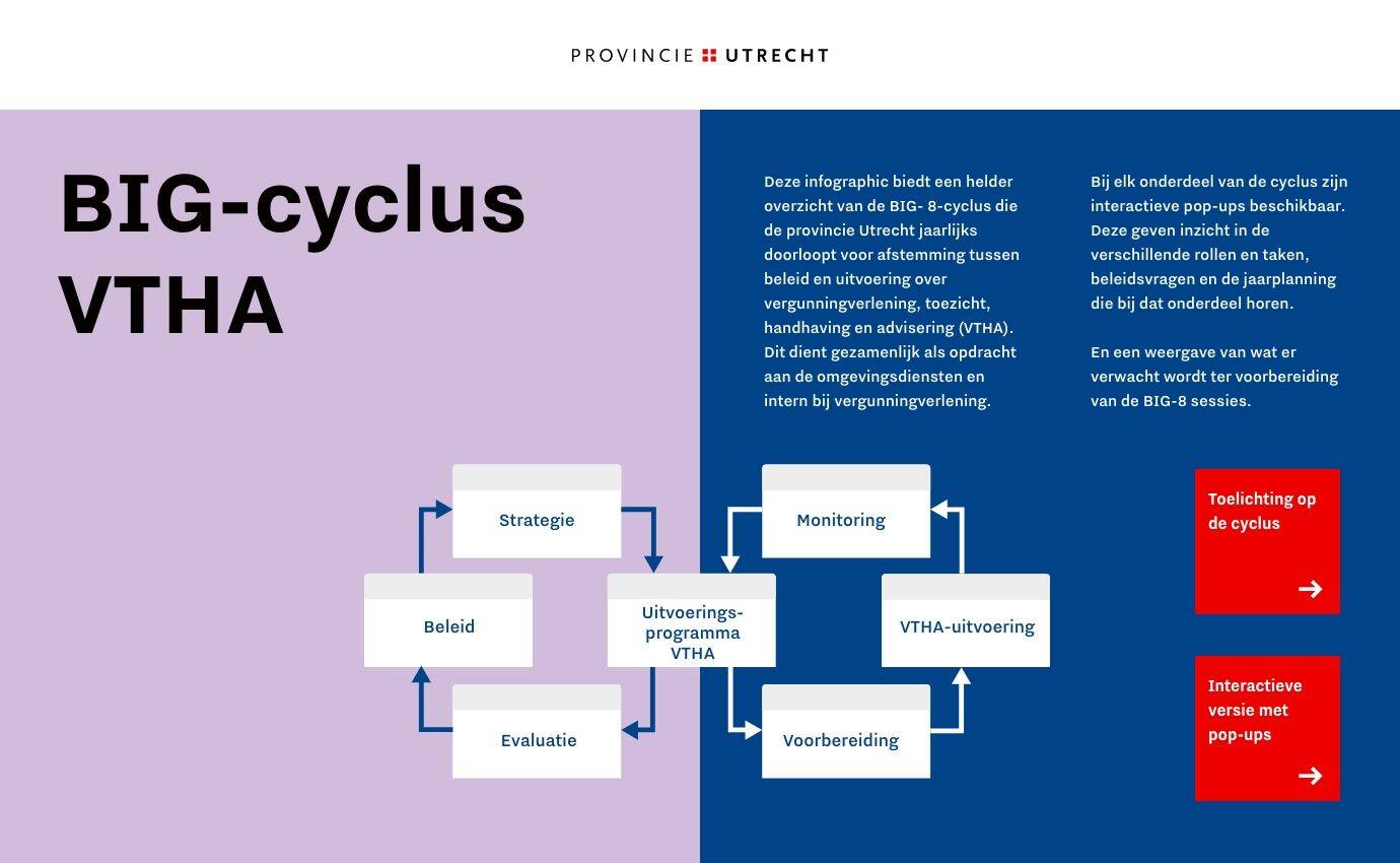 Deze infographic biedt een helder overzicht van de BIG-8 cyclus die de provincie Utrecht jaarlijks doorloopt voor afstemming tussen beleid en uitvoering over vergunningverlening, toezicht, handhaving en advisering (VTHA). Dit dient gezamenlijk als opdracht aan de omgevingsdiensten en intern bij vergunningverlening.