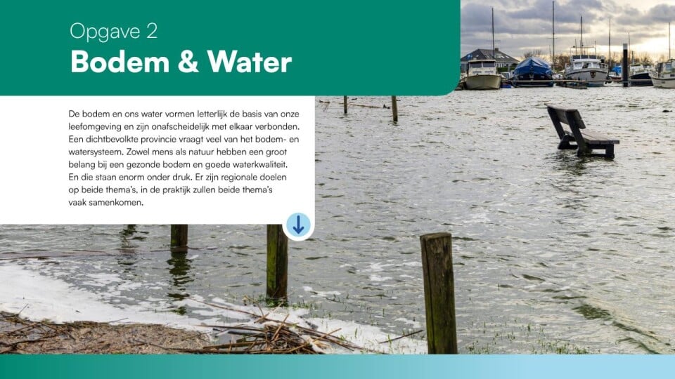De bodem en ons water vormen letterlijk de basis van onze leefomgeving en zijn onafscheidelijk met elkaar verbonden. Een dichtbevolkte provincie vraagt veel van het bodem- en watersysteem. Zowel mens als natuur hebben een groot belang bij een gezonde bodem en goede waterkwaliteit. En die staat enorm onder druk. Er zijn regionale doelen op beide thema’s, in de praktijk zullen beide thema’s vaak samenkomen.