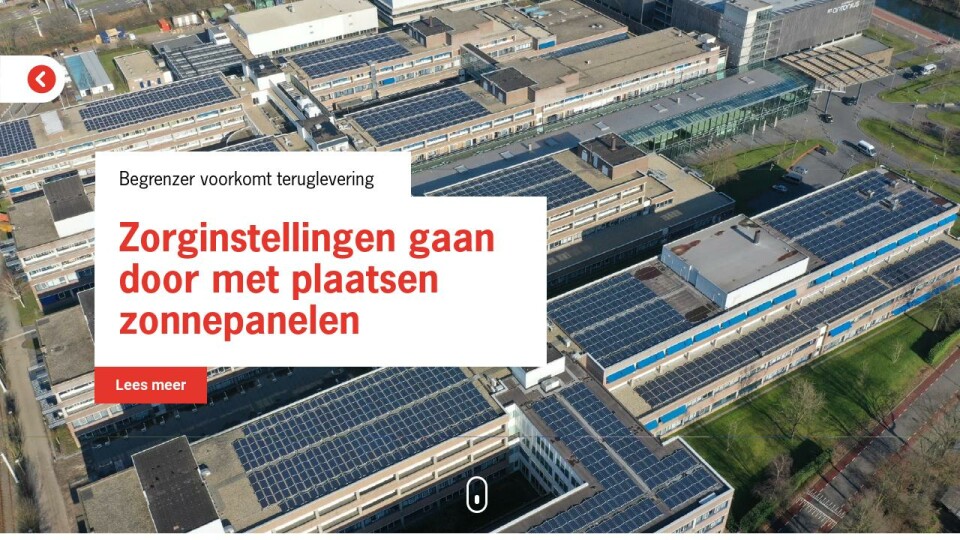 “Ik moedig zorginstellingen aan om voordat ze hun plannen in de koelkast zetten, eerst goed uit te zoeken wat hun energieverbruik is en hoeveel ze met de panelen gaan opwekken,” zegt Wiarda. “Als de vraag continu hoger is dan de maximaal opgewekte energie levert het terugleververbod geen probleem op. Als tijdelijk toch meer energie wordt opgewekt dan binnen de muren van een gebouw wordt gebruikt, biedt een begrenzer uitkomst.”
